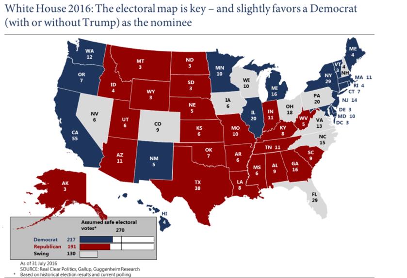 However, a look at the electroal map suggests a distincly structural advantage to Hillary Clinton. In order to secure the needed 270 electoral votes to win the Presidency, Trump has to win Florida, Ohio and retain North Carolina. Clinton can afford to lose these states except Pennsylvania, assuming she manages to retain Colorado and Virginia.