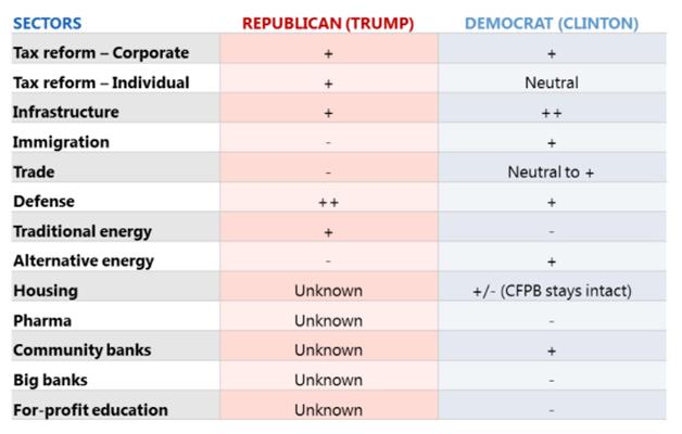 The U.S. government’s fiscal and regulatory policies have significant impact on the overall economy. The effect is even more pronounced on specific sectors due to large variation in particular policy preferences. For example, traditional energy companies, particularly fracking and and coal companies, are likely to have a friendly regulatory environment under a Republican Presidency, and a hostile one under a Democratic administration. Similarly, alternative energy is likely to beneft from larger subisides under a Democratic administration. The chart below shows the likely impact of different polictical dispensations on selected economic sectors.