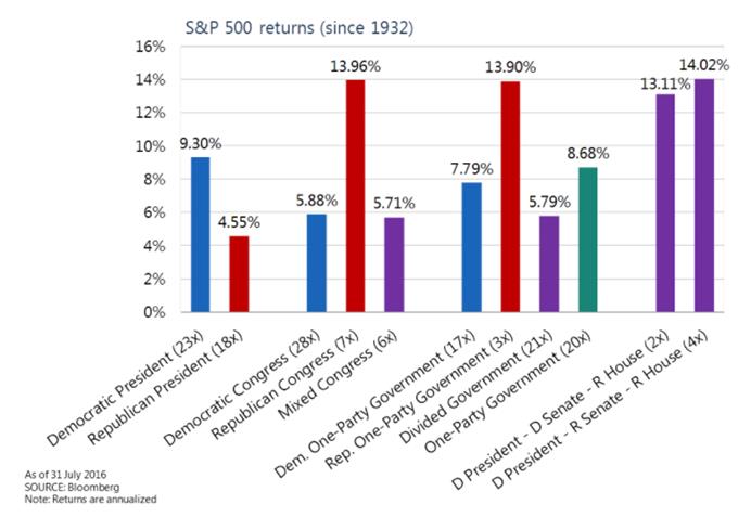 At the time of writing this letter, we think the continuation of a Republican Majority in the House of Representatives is a near certainty. In the remaining weeks before the election, Hillary Clinton has a distinct, but not unsurmountable, edge over Donald Trump. The balance of power in the Senate is evenly poised and very tough to predict either way. A divided government, where the Executive and Legislative branches are under the control of different parties, seems like a very plausible scenario at this juncture.