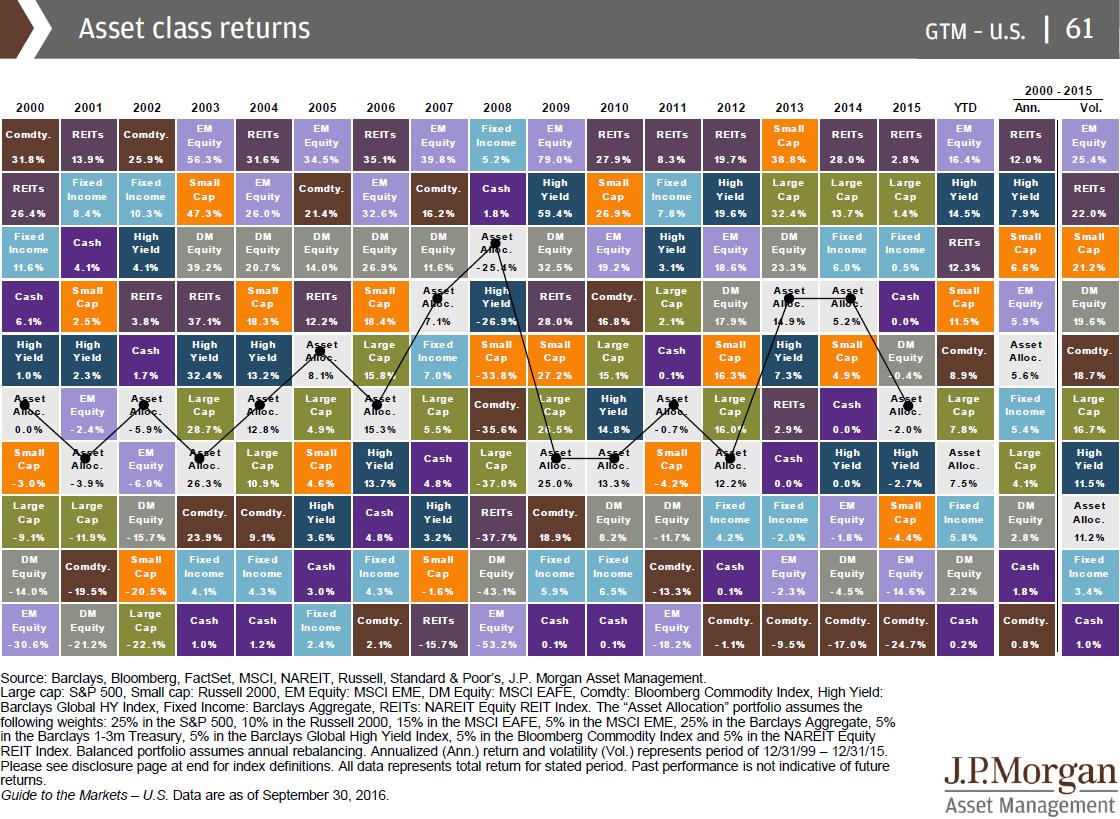 The chart below shows rankings of different asset classes based on their performance. As can be seen below, a diversified asset allocated portfolio always is in the median range of returns, though individual asset classes can fluctuate from very high returns to large negative returns. In the long run, the median steady returns give competitive returns with less volatility.
